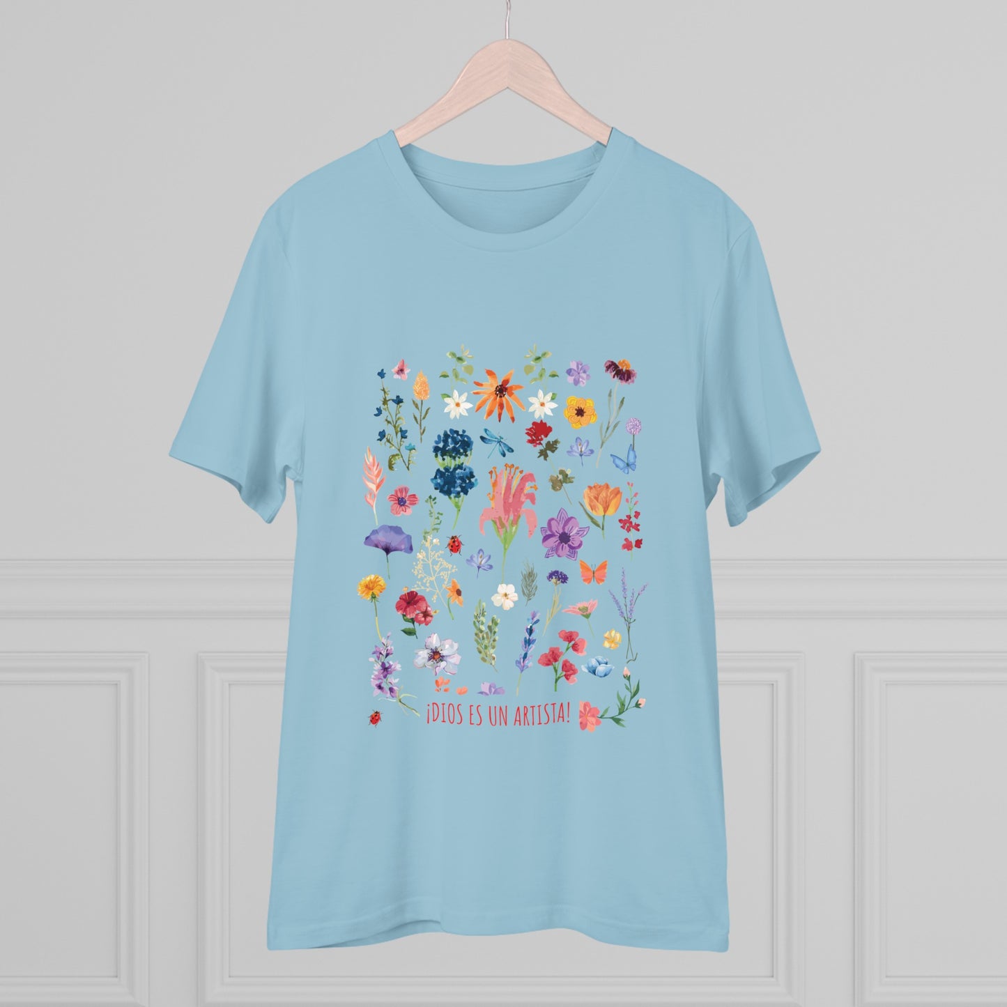 Camiseta playera con mensaje bíblico cristiano, unisex 100% algodón orgánico. Mensaje original floral. "God is an artist!" Amplia variedad